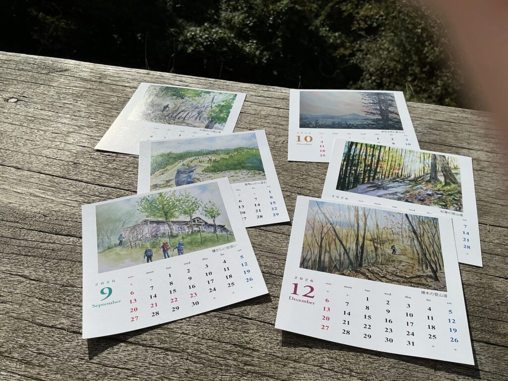 こちらでは佐藤けんいちさんの水彩画カレンダー、七ツ石小屋手ぬぐい、七十周年記念バッジなども販売します。